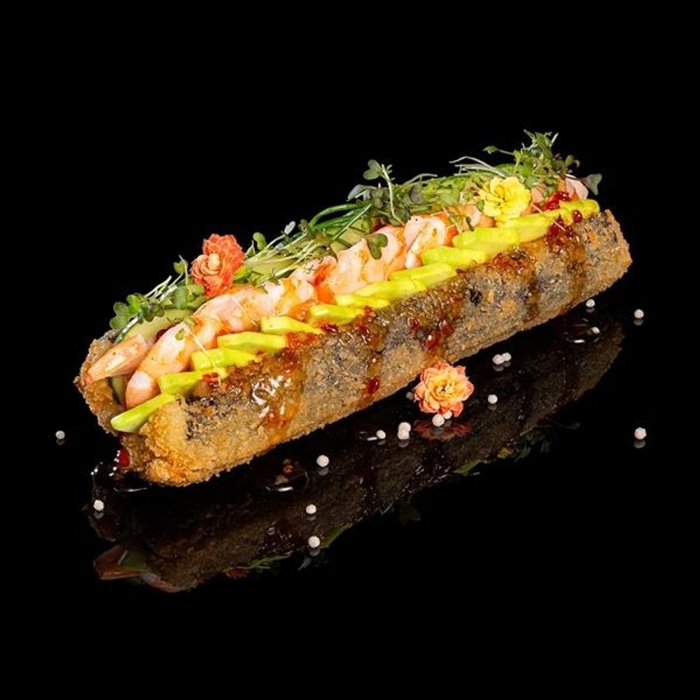 Креветка тигровая, сурими, огурец, авокадо,рис, водоросли нори, соус чили сладкий, кляр, сухари панко