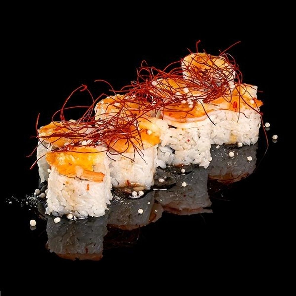 Креветка тигровая, сыр дор блю, сыр пармезан, груша, сыр сливочный, рис, водоросли нори, соус чили сладкий * Соевый соус, имбирь, васаби в комплект не включены