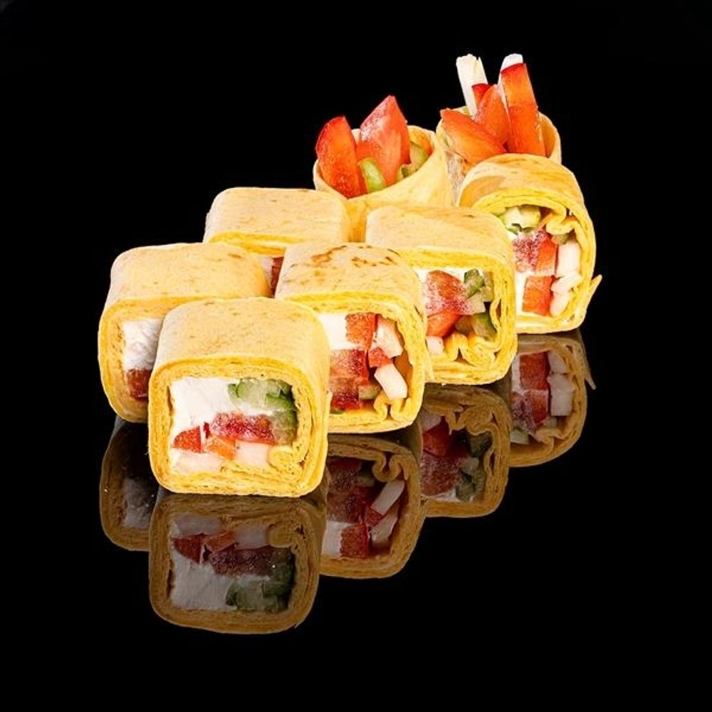 Помидор свежий, огурец, капуста пекинская, перец красный сладкий, сыр сливочный, тортилья сырная * Соевый соус, имбирь, васаби в комплект не включены