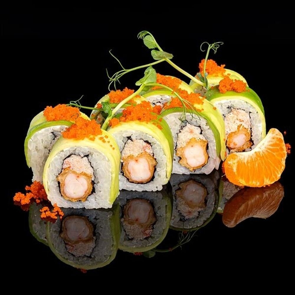 Мясо краба, креветка тигровая в панировке, апельсин, соус спайси, рис, водоросли нори, авокадо, икра масаго * Соевый соус, имбирь, васаби в комплект не включены