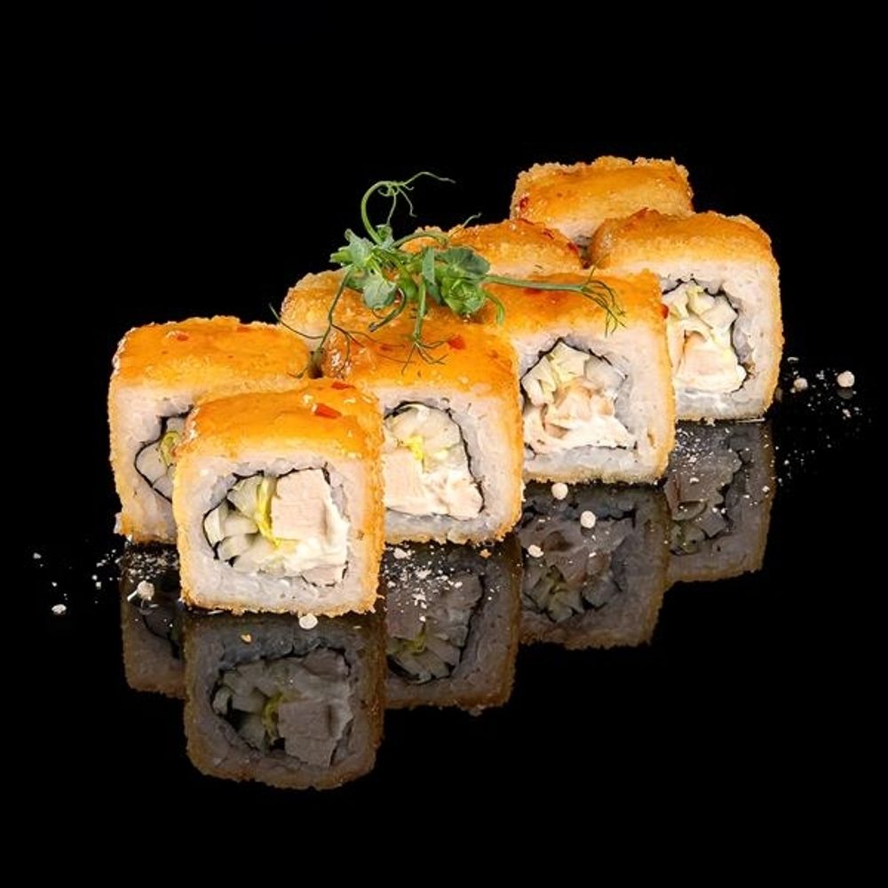 Филе куриное, капуста пекинская,сыр сливочный, рис, водоросли нори, сыр сливочный, кляр, сухари панко, соус чили сладкий