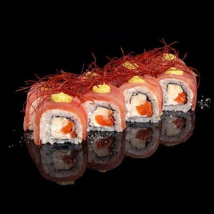 Форель мурманская, водоросли нори, кляр, сухари панко * Темпура роллы не являются горячими. Темпура- наличие корочки из кляра * Соевый соус, имбирь, васаби в комплект не включены