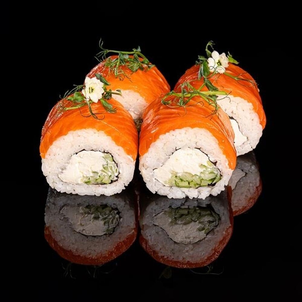 Форель мурманская, сыр сливочный, огурцы, рис, водоросли нори * Имбирь, васаби в комплект не включены
