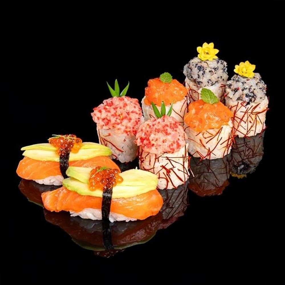 Суши сяке с авокадо и красной икрой 2шт, тар тар тунец (основа рис,огурец,нити чили) 2шт, тар тар форель (основа рис,огурец,нити чили) 2шт, тар тар корюшка (основа рис,огурец,нити чили) 2шт