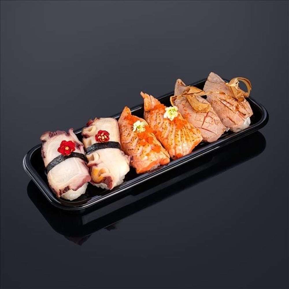 суши с осьминогом 2шт, опаленные суши с форелью 2шт, опаленные суши с тунцом 2шт * Соевый соус, имбирь, васаби в комплект не включены