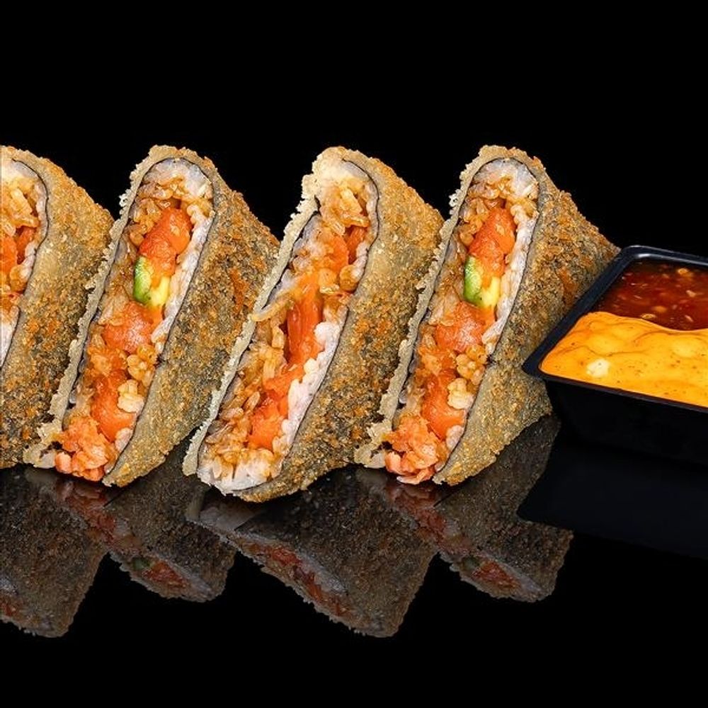форель мурмаснская, рис, нори, авокадо, соус цезарь, кляр, сухари панко, соус спайси, соус чили * Темпура блюда не являются горячими. Темпура- наличие корочки из кляра * Соевый соус, имбирь, васаби в комплект не включены