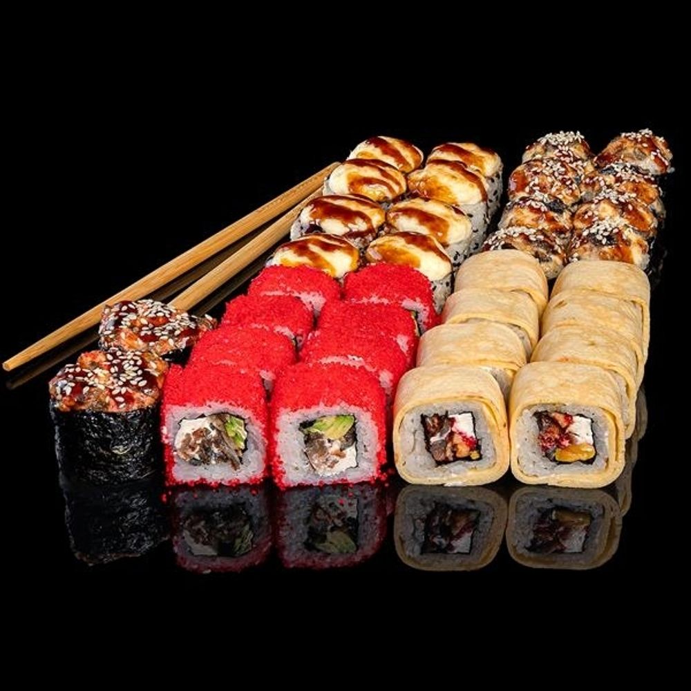 Калифорния с угрем, Уна эби хот, Уна сяке хот, Томаго унаги, Гункан унаги хот, васаби 10 гр, имбирь 30 гр, соевый 100 мл