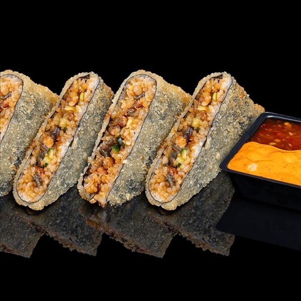 угорь, рис, нори, огурец, соус унаги, кляр, сухари панко, соус спайси, соус чили