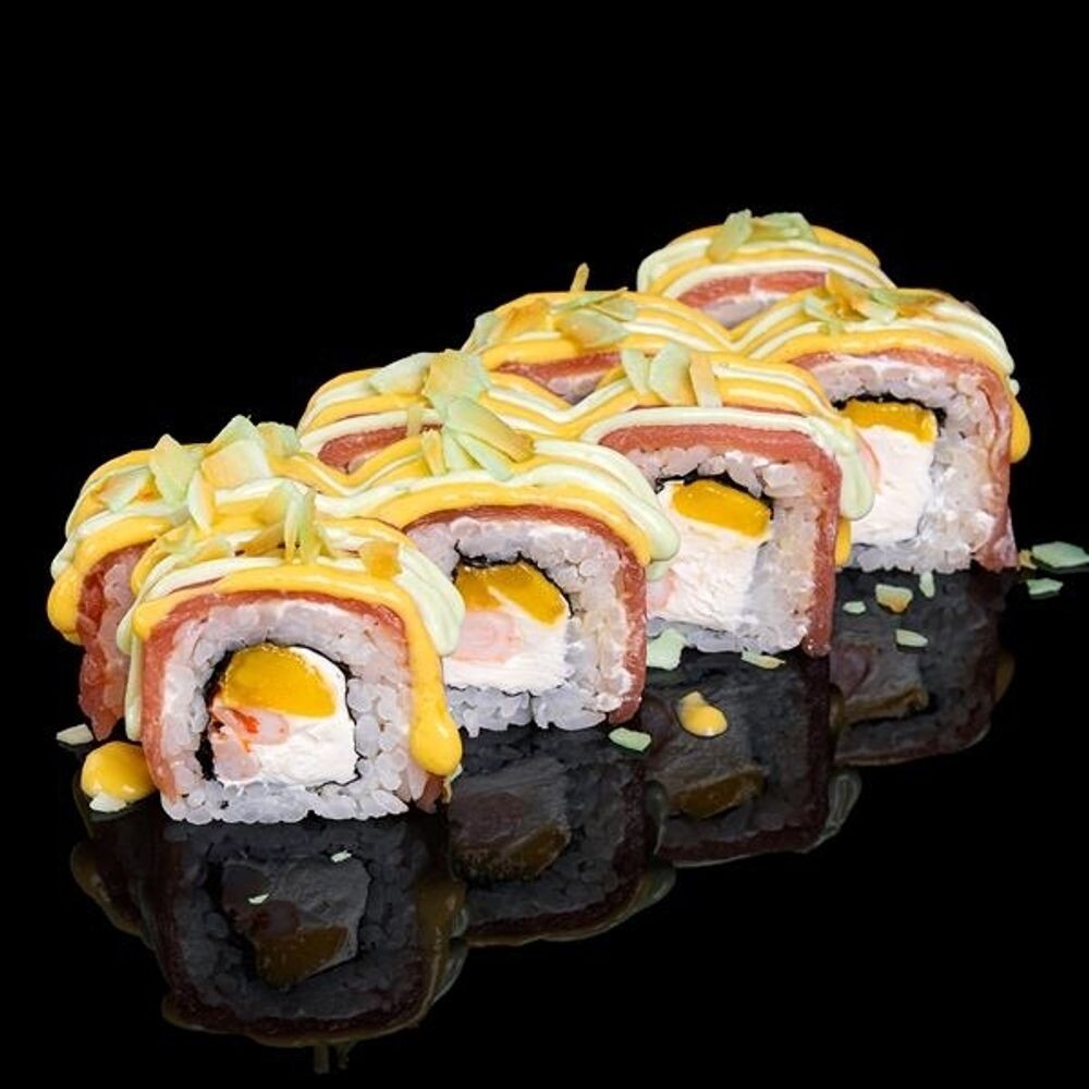 Ролл "Манговый тунец" — это гармоничное сочетание свежести и экзотики. В его составе свежий тунец и креветка тигровая, обернутые в мягкий рис и нори. Внутри ролла скрывается сливочный сыр и сочное манго, придающие блюду нежность и сладость. Дополняет вкус соус васаби с майонезом и сгущённым молоком, придающий пикантность и кремовость. Манговый майонез с имбирём и сладким чили соусом добавляют яркую нотку и пикантность, а кокосовые чипсы — хрустящую текстуру и тропическую свежесть. Этот ролл — настоящее наслаждение для любителей необычных и вдохновляющих вкусов!