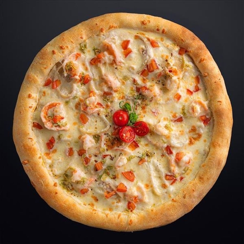 Пицца "Морская" — это настоящее наслаждение для любителей свежих морепродуктов. Хрустящее тонкое тесто служит идеальной основой для мягкого слоя соуса ранч, который придает блюду нежную сливочную нотку с легким пряным оттенком. В центре — сочные тигровые креветки и нежные кальмары, которые дарят богатство морского вкуса и аромат. Сливочный сыр моцарелла плавится и покрывает все ингредиенты, создавая аппетитную тянущуюся корочку. Свежие ломтики помидора и ароматный чеснок дополняют композицию, придавая пицце яркую свежесть и пикантность. "Морская" — это гармоничное сочетание свежести морских деликатесов и насыщенных вкусов, которое перенесет вас прямо на берег моря.