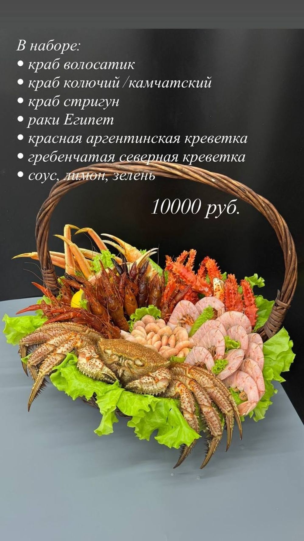 Краб волосатик, краб колючий/ камчатский, краб стригун, раки египед, красная аргентинская креветка, гребенчатая северная креветка зелень, соус, лимон